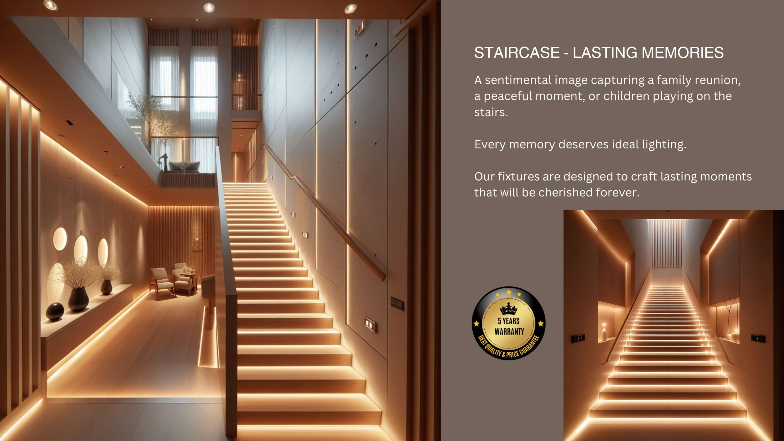 • Contrast and Visibility: Properly lit stairs enhance visibility, especially in dimly lit areas. Consider using warmer color temperatures for a cozy feel.