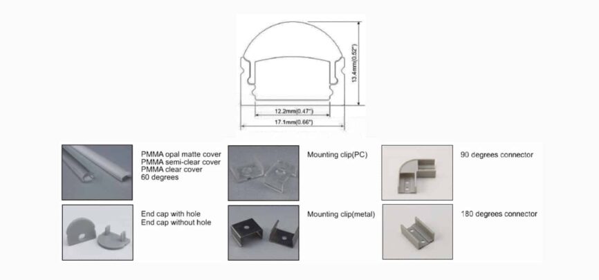 Transparent and Opal PC covers/ diffusers with surface mounting accessories help to form uniform lighting. Made available with high-grade aluminium AL6063-T5 and powder coated in silver/black/white finishes. These LED profiles can also be installed in curtain lighting, cabinets, retail outlets and cove lighting.